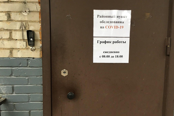 Хотя из-за двери с табличкой «Районный пункт обследования на COVID-19» выходят люди, очередь почти не сокращается — внутрь запускают очень медленно.