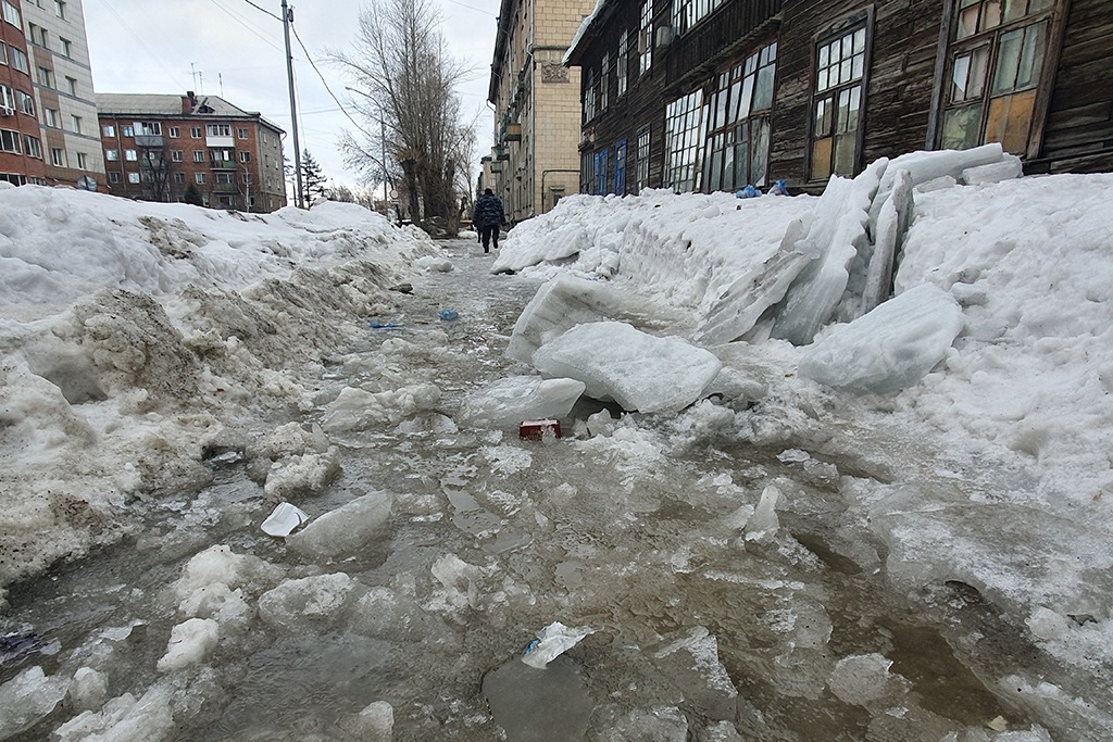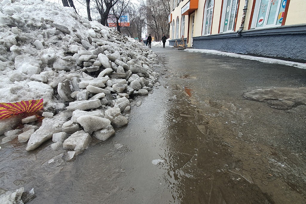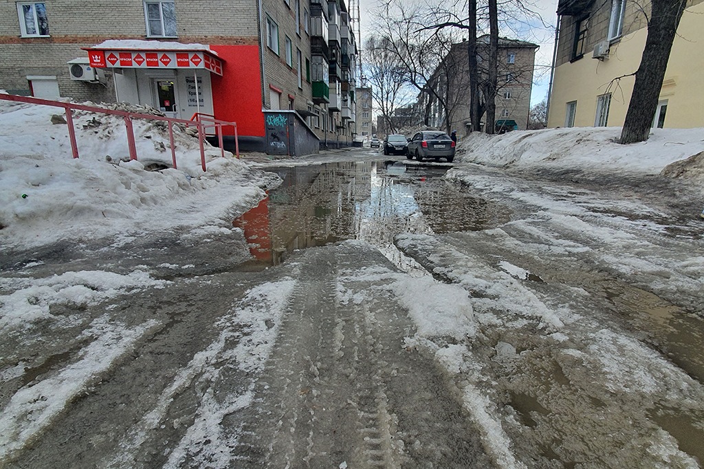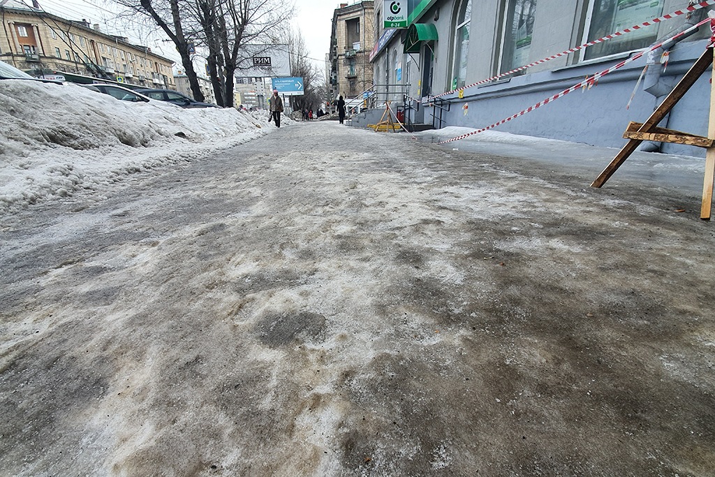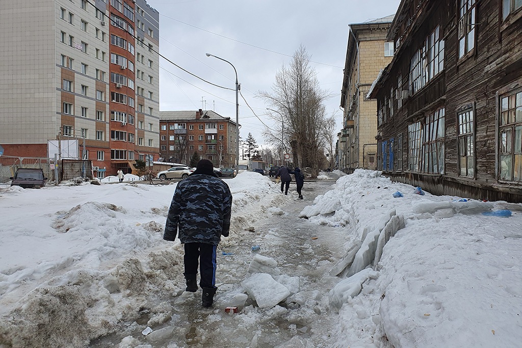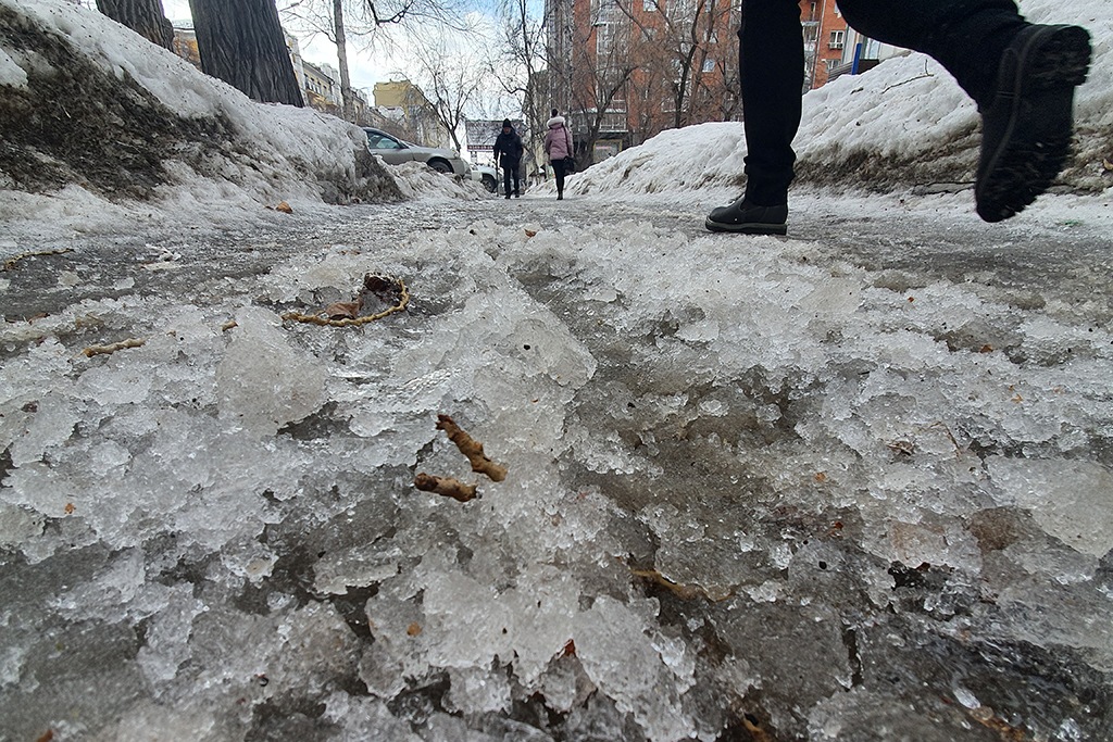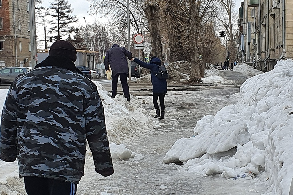 На улицах Новосибирска начал таять снег. Тротуары, которые зимой решили не убирать, весной превратились в кашу.