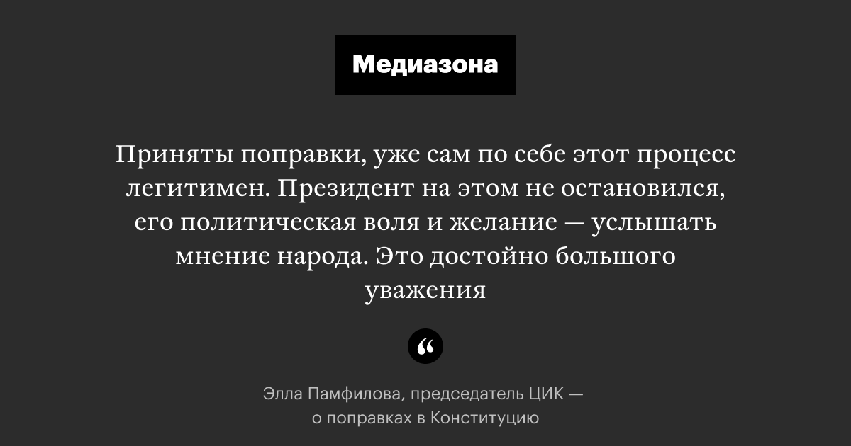 «Принят уже этот закон, приняты поправки, уже сам по себе этот процесс легитимен. И только можно отнестись с большим уважением к тому, что президент на этом не остановился, и его политическая воля и желание — услышать в данном случае не предусмотренное действующей Конституцией мнение народа. Дополнительно, [это] ключевая фраза! Он на это пошел, это достойно большого уважения», — сказала Памфилова.