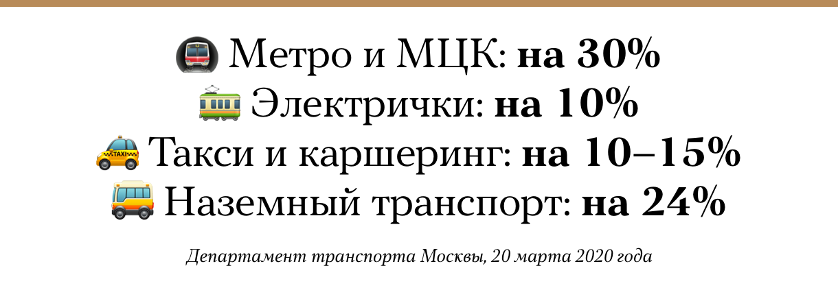 Департамент транспорта Москвы опубликовал статистику об изменении числа поездок в общественном транспорте с 2 по 19 марта. За это время в Москве из-за пандемии коронавируса были отменены занятия в школах и вузах. Всех жителей города, которые вернулись из стран Европы, обязали оставаться на домашнем карантине и не посещать работу.
