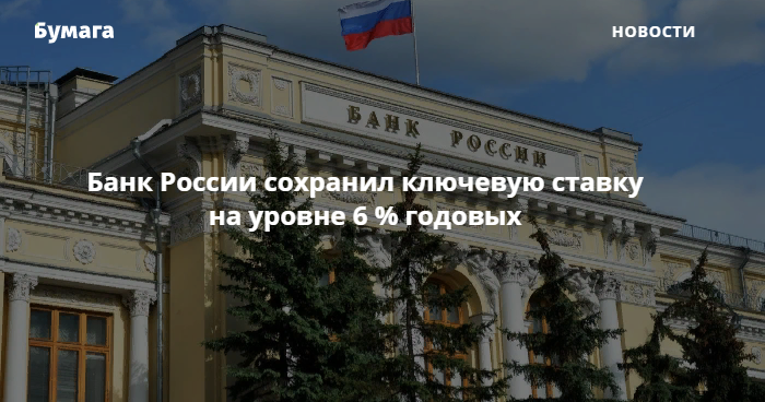 Банк России оставил ключевую ставку на уровне 6 % годовых. Об этом сообщает пресс-служба регулятора.