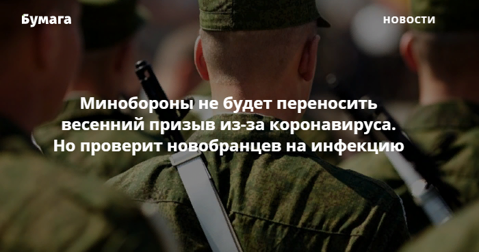 Минобороны России отказалось переносить весенний призыв в армию из-за коронавируса. Он начнется 1 апреля и продлится до 15 июня, сообщает «Интерфакс» со ссылкой на министра обороны Сергея Шойгу.