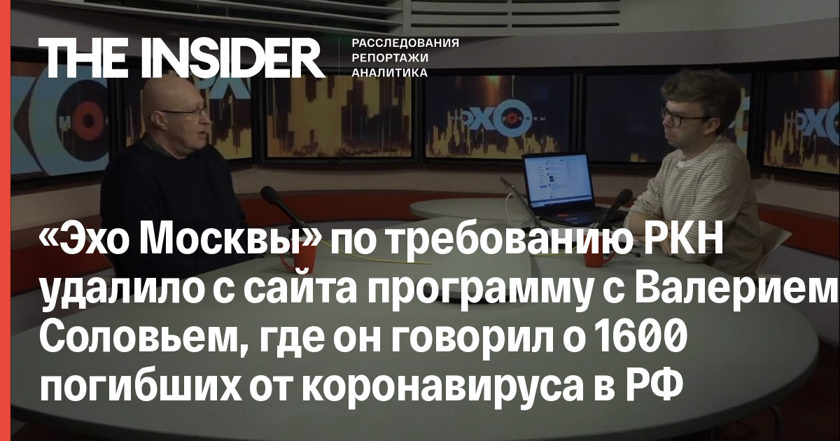 «Эхо Москвы» по требованию РКН удалило с сайта программу с Валерием Соловьем, где он говорил о 1600 погибших от коронавируса в РФ