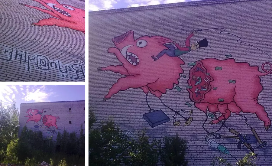 В 2013 я начал зарабатывать промышленным альпинизмом, использовал эти навыки для рисования на больших стенах. Например, вот розовая свинья, которую разорвало на две части. Эта работа говорит о том, что очень небольшому количеству людей, буквально нескольким, принадлежит половина мирового богатства. И вот, свинюшку разорвало от напряжения, и из неё сыплются деньги, их ловят люди, которые находятся в задней части свиньи. Они не управляют процессом, не решают куда свинья бежит. К свинье привязаны вещи: шприц, автомат, которые есть у людей из той или иной половины. Шприцы, молоток, оружие — это не призыв.