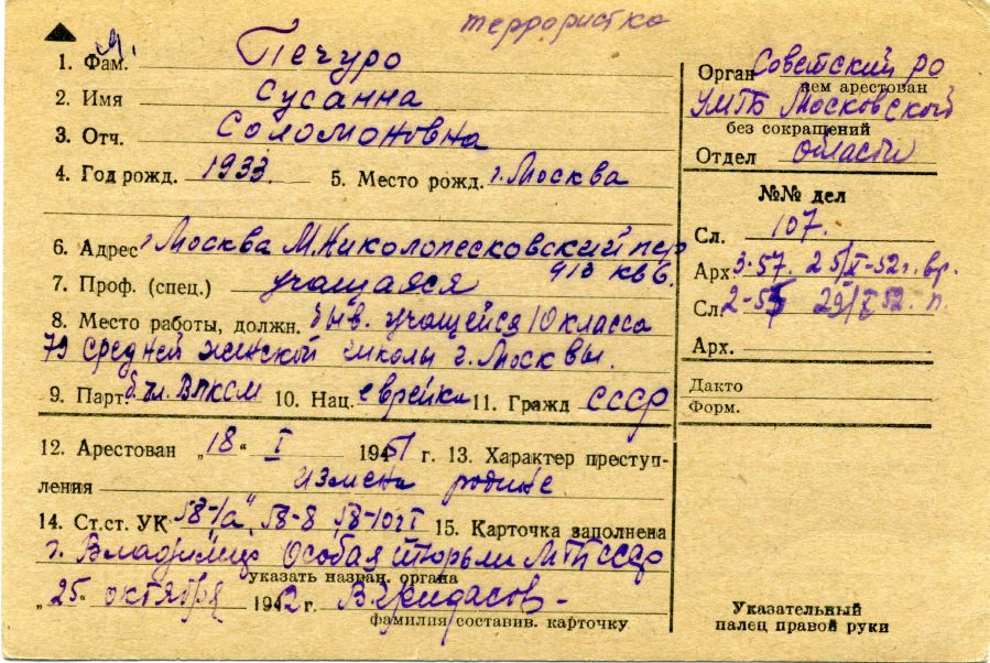 Сусанна Печуро была восемнадцатилетней школьницей, когда Военная коллегия Верховного суда СССР приговорила ее к страшному лагерному сроку — 25 лет. Ее вина была в том, что девушка состояла в маленькой молодежной организации, где обсуждались нестыковки между послевоенной реальностью и заветами Ленина.