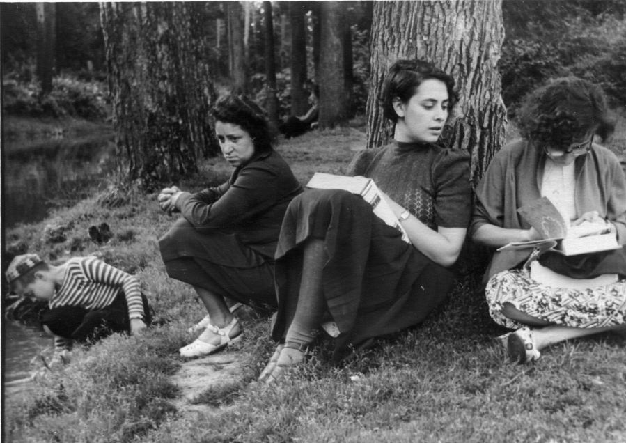 Сусанна Печуро с Е. Афроимовой, Идой Винниковой и братом Мишей готовятся к вступительному экзамену на истфак МГУ. Павшино, лето 1956. С. Печуро сидит с первым томом Всемирной историиФото: личный архив А.А. Макарова