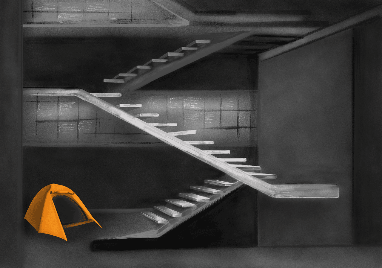 «Выберите максимально ровную поверхность, очистите её от острых камней и веток, по возможности используйте естественную защиту от ветра, такую как большие каменные валуны или густой кустарник», — кажется, всё сходится. Разве что мне не нужны ни валуны, ни кустарники. Я сидел на ступеньках, устанавливал палатку посреди лестничной площадки чёрного хода закрытого на карантин бизнес-центра. Кажется, охрана внизу, на проходной, уже что-то подозревала. Мы жили здесь уже несколько ночей и подумывали о том, чтобы сменить убежище. Жизнь в Китае бывает сложной, особенно если у тебя совершенно нет денег, твои документы просрочены, тебе нечего есть и совсем некуда податься.
