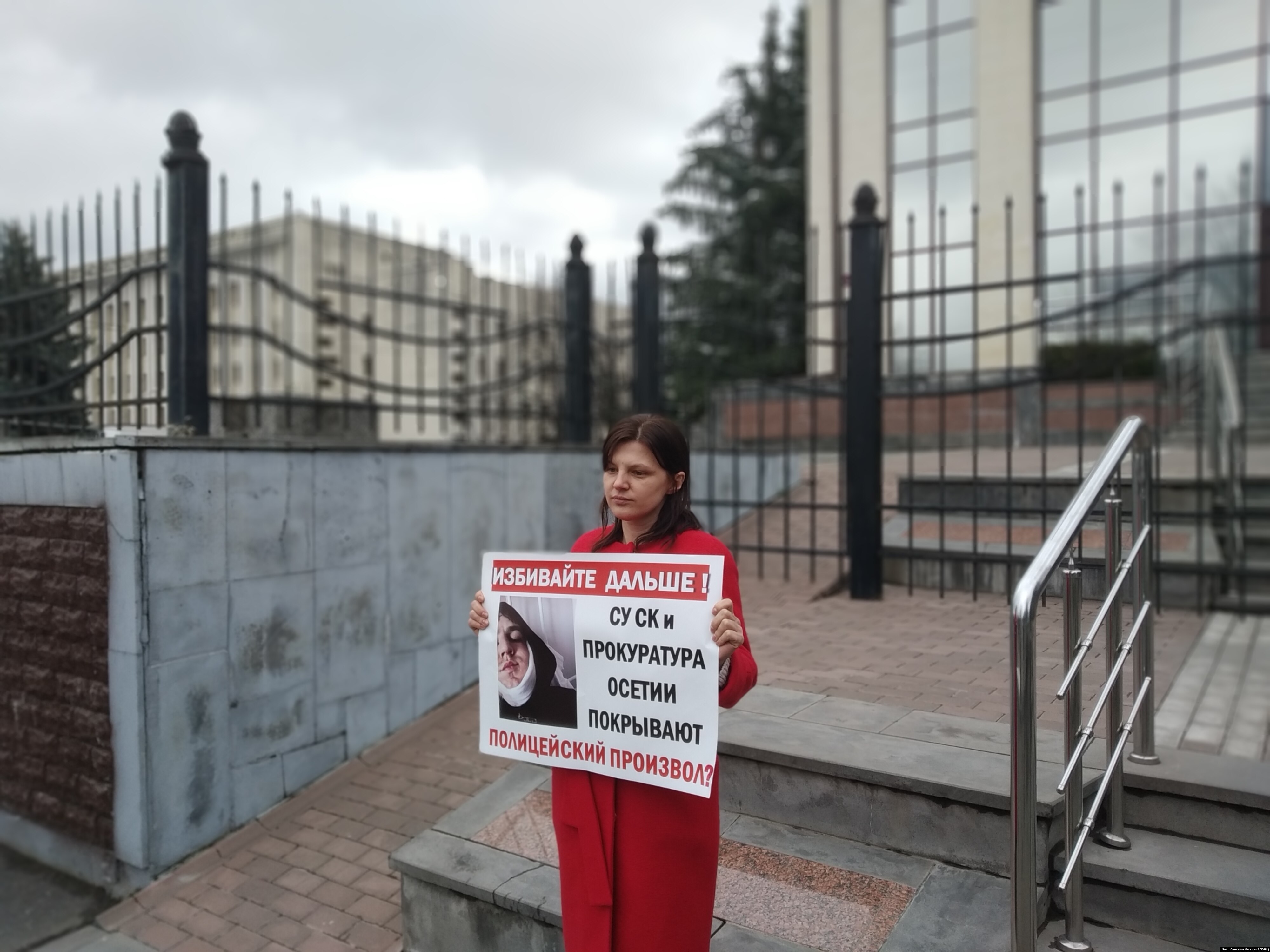 Она получила уже 14 постановлений, но сдаваться не собирается. В конце прошлой недели она в третий раз вышла на одиночный пикет к республиканской прокуратуре. На ее плакате было написано "Избивайте дальше. СУ СК и Прокуратура Осетии покрывают полицейский произвол?".