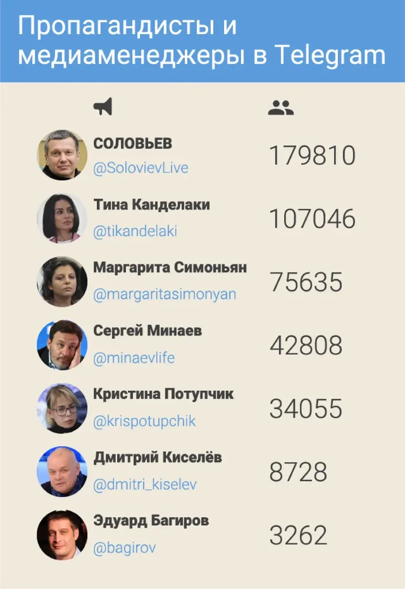 В результате Telegram появились целые «сетки каналов», связанных с властью. Это «сетка» Кристины Потупчик, «сетка» Станислава Апетьяна, «сетка» Сергея Минаева, «сетка» Эдуарда Багирова, «сетка» Маргариты Симоньян, «сетка» Алексея Гореславского, перечисляет источник «Новой».