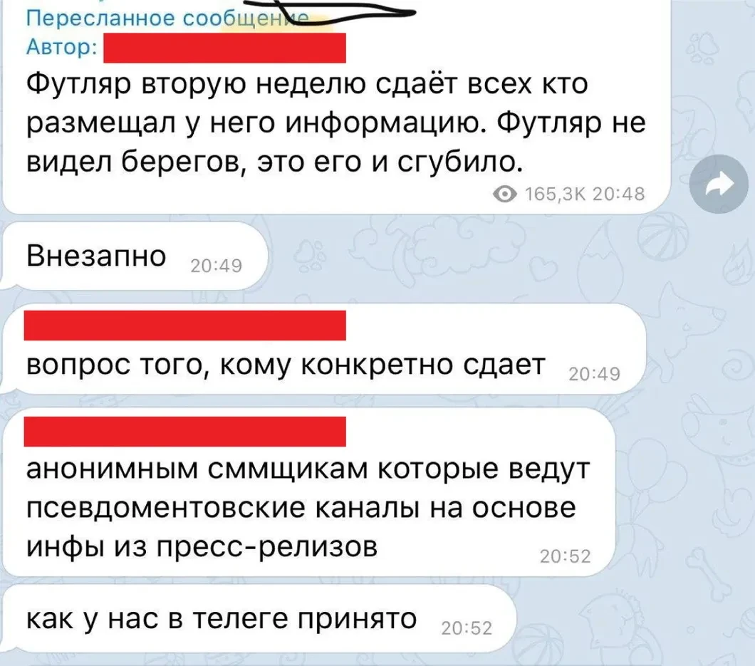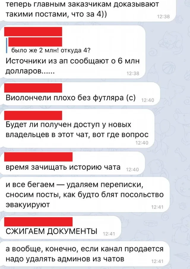 Когда в чате «Телеграмбюро 3.0» (закрытом клубе владельцев и администраторов крупнейших телеграм-каналов, представляющих 80–90% всей российской телеграм-аудитории; среди них, например, блогер Илья Варламов и Никита Могутин, основатель Baza) один из участников поинтересовался, есть ли у захвативших «Футляр» доступ в этот чат, порядка десяти участников тут же удалились из беседы. «Время зачищать историю чата», — написал один из них (скриншоты из переписки есть в распоряжении «Новой»). «СЖИГАЕМ ДОКУМЕНТЫ. <…> Если канал продается, надо удалять админов из чата», — ответил другой.