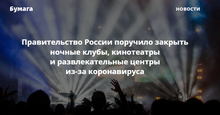 Правительство России поручило закрыть ночные клубы, кинотеатры и развлекательные центры из-за коронавируса