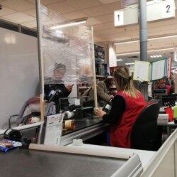 В супермаркетах возводят прозрачные защитные экраны для кассиров из пленки, продлено время работы до 2:00 ночи вместо обычных 22–23 часов, на входе контролёр, ограничивающий число одновременно находящихся в зале, перед ним очередь 3–4 человека на вход. На полу возле касс метки, чтобы соблюдать дистанцию в очереди, кассиры в латексных перчатках, принимается только бесконтактная оплата товара.