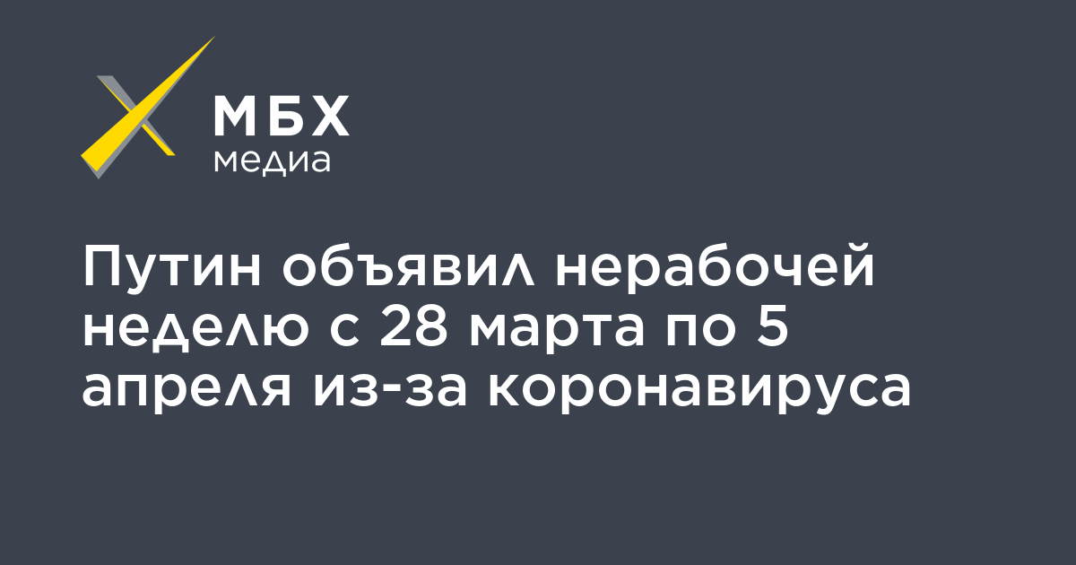 Неделя с 28 марта по 5 апреля объявлена нерабочей в связи с угрозой распространения коронавируса, заявил Владимир Путин.