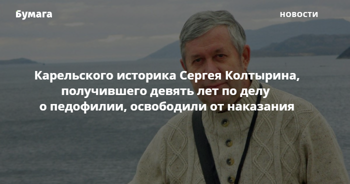Медвежьегорский районный суд освободил от наказания историка Сергея Колтырина, осужденного на девять лет колонии по обвинению в педофилии. Об этом сообщает «КарелИнформ» со ссылкой на пресс-службу суда.