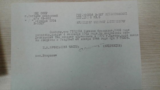 Справка о смерти Евгении Яковлевны Гендиной Фото: Архив НИПЦ "Мемориал". Москва). Это было последнее письмо Евгении Гендиной. О том, что женщина умерла в лагере в Магадане 4 сентября 1943 года, ее дети узнали только в 1954 году. Когда им пришло письмо из МВД Магаданской области, что им следует обратиться за свидетельством о смерти в ЗАГС города Одессы. В УВД Одессы, в свою очередь, отказали в выдаче свидетельства, так извещение о смерти Евгении Гендиной к ним не поступало.