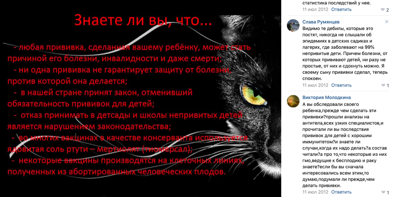 Одна из причин недоверия к вакцинам – отсутствие доступной и проверенной медицинской информации о том, почему важно делать прививки. Официальные плакаты в поликлиниках и научные исследования со сложными терминами не могут убедить широкую аудиторию. При этом популярные блогеры рассказывают подписчикам, как лечиться биологическими добавками, и призывают к отказу от традиционной медицины и вакцинации. В социальных сетях появляются группы антипрививочников с картинками-мотиваторами, легко привлекающими внимание. А почти любой диалог в комментариях сразу же переходит во взаимные обвинения, в которых эмоций больше чем фактов.