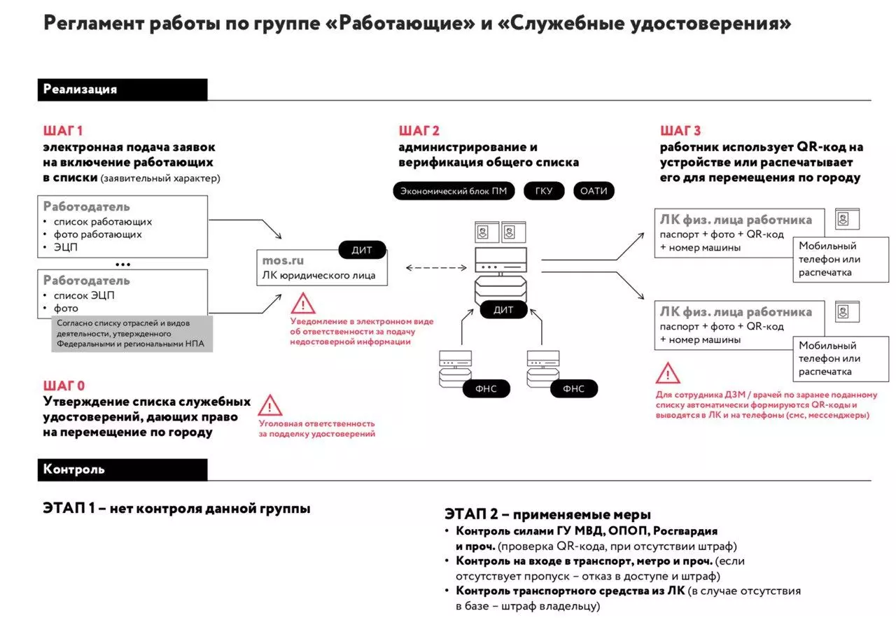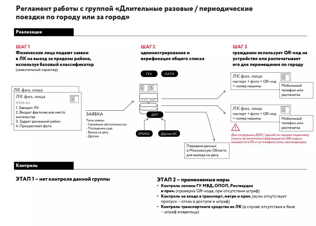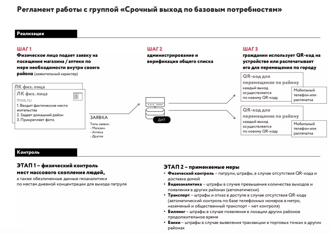 В сети появились «регламенты работы» после введения в столице пропускного режима. Они делят жителей Москвы на несколько групп — по типу необходимости выхода на улицу — как служебной, так и неслужебной. Обычным гражданам выход на улицу будет разрешен только после предварительной заявки в личном кабинете на mos.ru (сайте мэрии). Желающий выйти должен будет получить OR-код, на улицу можно будет выходить только с кодом в смартфоне или его распечаткой.
