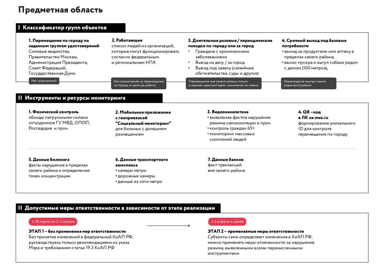 Кроме базового физического контроля передвижений при помощи Росгвардии и МВД подразумевается выпуск специального мобильного приложения «Социальный мониторинг» для работы с геолокацией, слежка по мобильной связи (биллинг); введение QR-кодов — уникальных идентификаторов для жителей Москвы после обязательной регистрации на сайте mos.ru.