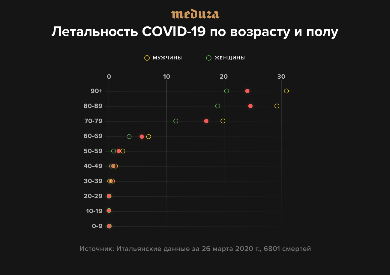 При болезни COVID-19, вызываемой новым коронавирусом, риски осложнения, госпитализации, необходимости интенсивной терапии и смерти крайне неравномерно распределены по возрасту. Дети и молодые люди практически вне опасности, но для людей старших поколений риски значительны. Кроме того, в любом возрасте для мужчин болезнь опаснее, чем для женщин. Вот рисунок, на котором отражена летальность COVID-19 в Италии по данным на 26 марта.