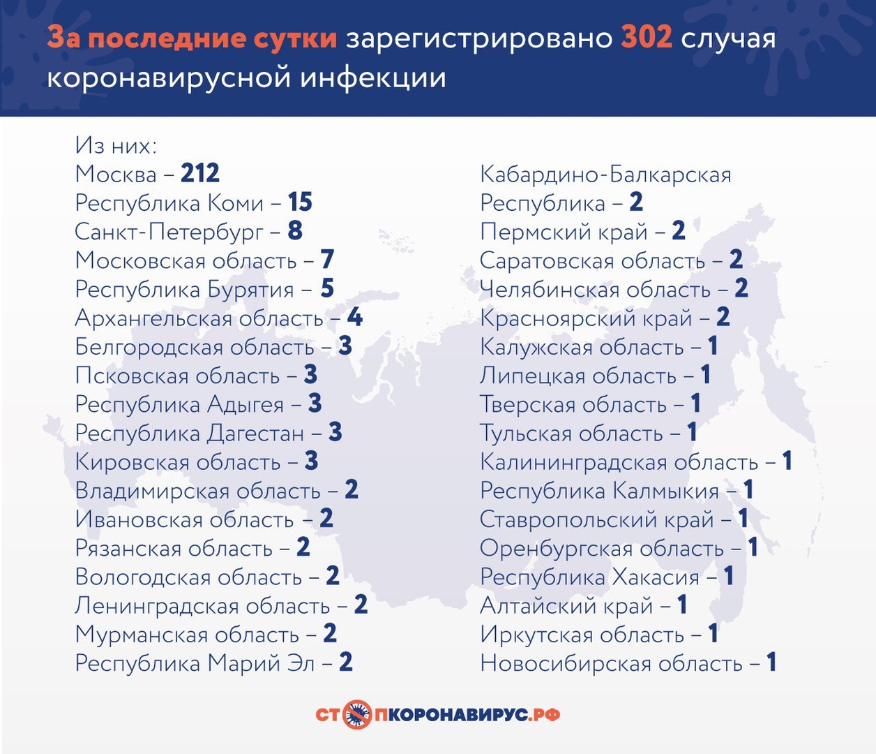В Москве зафиксировали 212 случаев заражения, в Республике Коми — 15, в Петербурге — восемь, в Московской области — семь. В Ленобласти заболели двое.