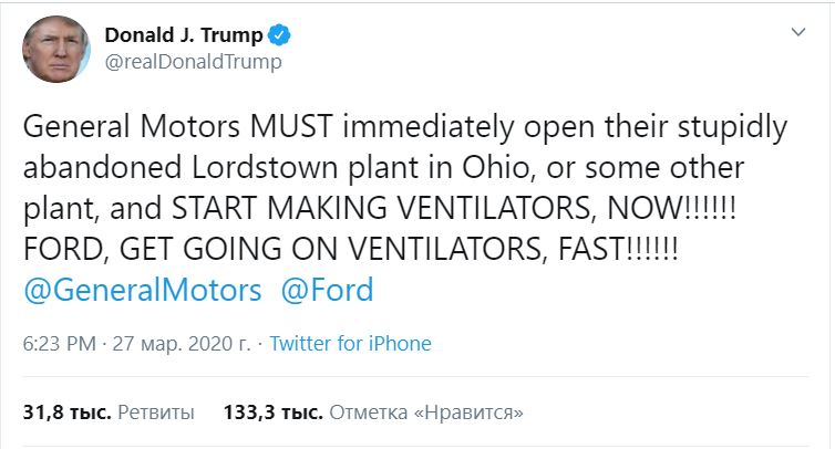 Самой скандальной темой в твиттере Дональда Трампа в марте стала перепалка руководства автогиганта GM, а ее кульминацией — твит от 27 марта: «General Motors ДОЛЖНЫ немедленно открыть свою закрытую по тупости фабрику в Огайо или любую другую и НАЧАТЬ ПРОИЗВОДИТЬ АППАРАТЫ ИВЛ, ПРЯМО СЕЙЧАС!!!!!!».