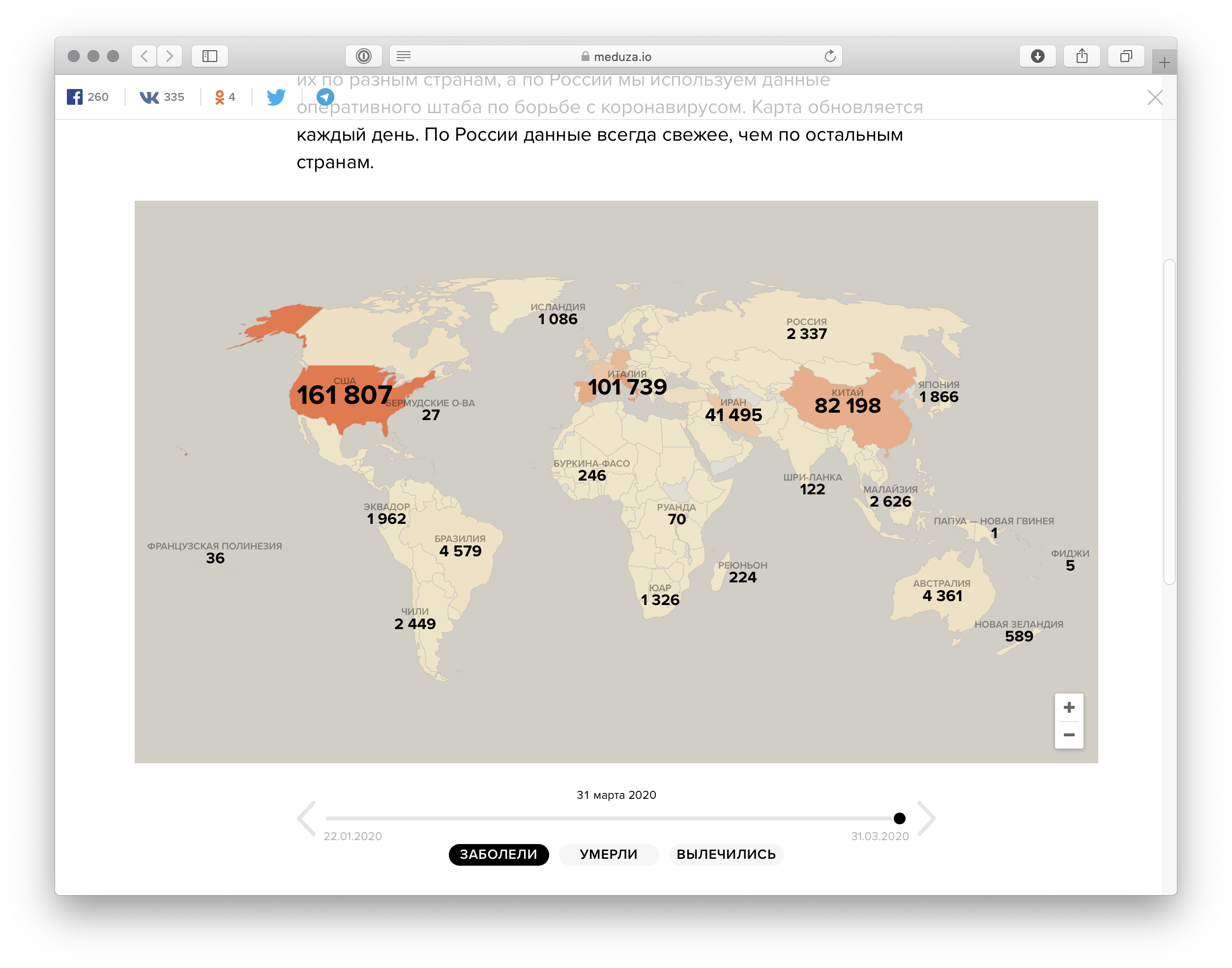 В России за сутки выявили 500 новых случаев заражения (за предыдущие — 302). Итого: 2337 случаев. За сутки умерли восемь человек. Общее число умерших достигло 17. Выздоровели 55 пациентов (всего — 121). В мире уже три страны обогнали Китай по числу выявленных случаев заражения — это США, Италия и Испания. В Штатах и Италии уже больше 100 тысяч случаев. Вы всегда можете посмотреть текущую ситуацию по коронавирусу на карте или в таблице. Данные обновляются раз в день.