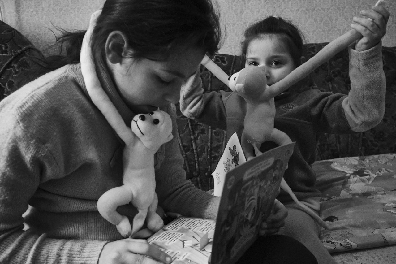 Маша, Илюша, Алина и Соня, худенькие и просто одетые, ерзают на диване, подкашливают. Алина ложится — ей тяжело. «Простудились», — оправдывается мама. Старшая, Маша, закрывается от объектива фотографа руками.