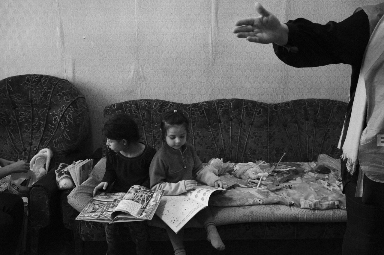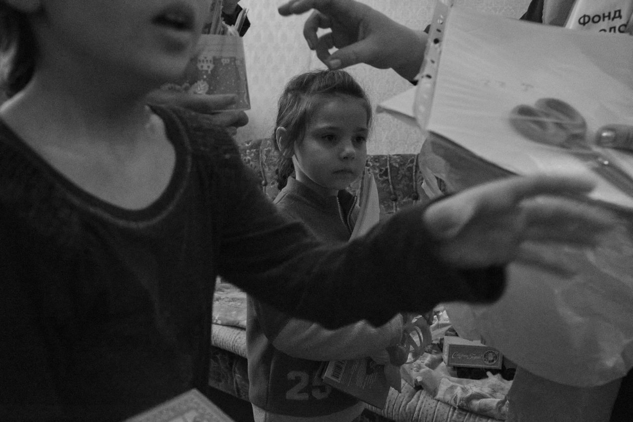 Волонтеры раздают книжки детям ЛюдмилыФото: Василий Колотилов для ТД Из пакетов вынимают стиральные порошки, семь толстых шерстяных одеял и комплектов постельного белья — самое важное для выживания. И, конечно, еда — много лука и картошки, хлеба и «другой вкуснятины». Затем тетрадки, фломастеры, ранец. Книги по рукоделию — это сразу Маше. Русские народные сказки, раскраски, журналы с наклейками. Игрушки: машинка, дурацкие смешные носы с очками и обезьянки-обнималки. Дети шумно («Мое! Мое!») напяливают носы и вешают на шеи обезьянок, только суровый Илья игнорирует все это и берет одну лишь машинку. Наконец из высшей ступени пирамиды потребностей — крещенская вода и книга «Библейские истории».