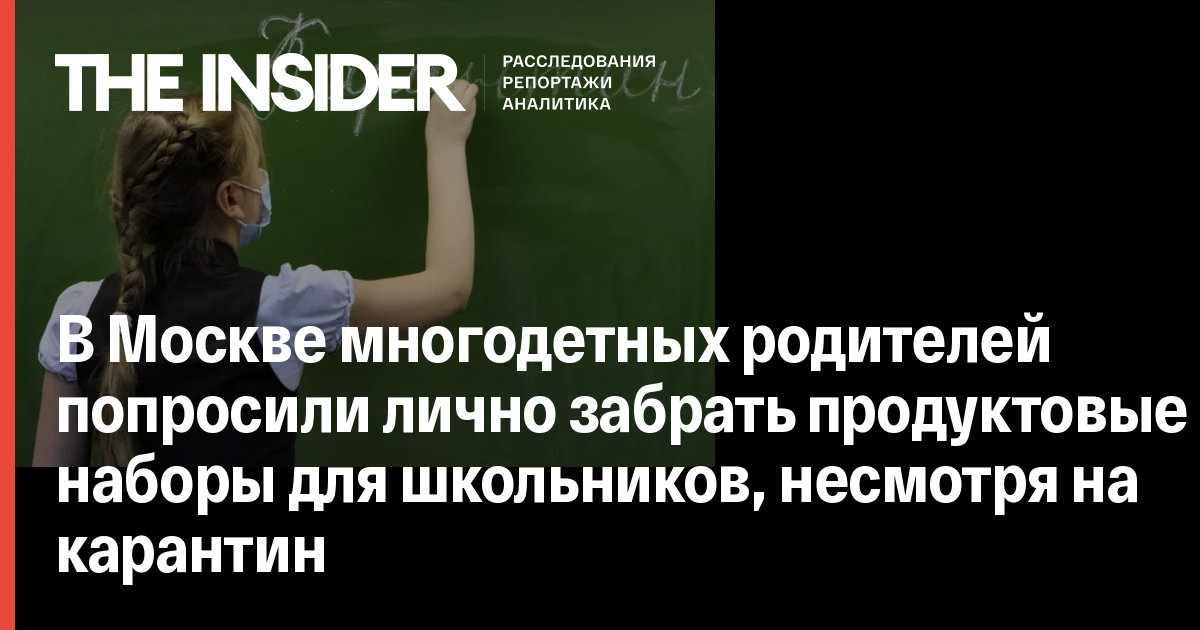 В Москве многодетных родителей пригласили лично приехать в школы, чтобы забрать бесплатные продуктовые наборы, полагающиеся им на время карантина. Вес одного набора составляет более 20 кг, а родителям детей, которые учатся в разных школах, придется съездить по нескольким адресам. Об этом The Insider сообщили родители школьников, получившие такие приглашения.