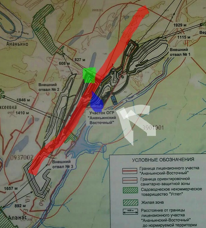 Красным обозначен участок дороги Листвяги-Апанас, синим — СНТ «Углеп, зеленым — электроподстанция поселков, серая стрелка показывает, где угольщики хотели сделать сброс техводы в реку Углеп (по данным общественников)
