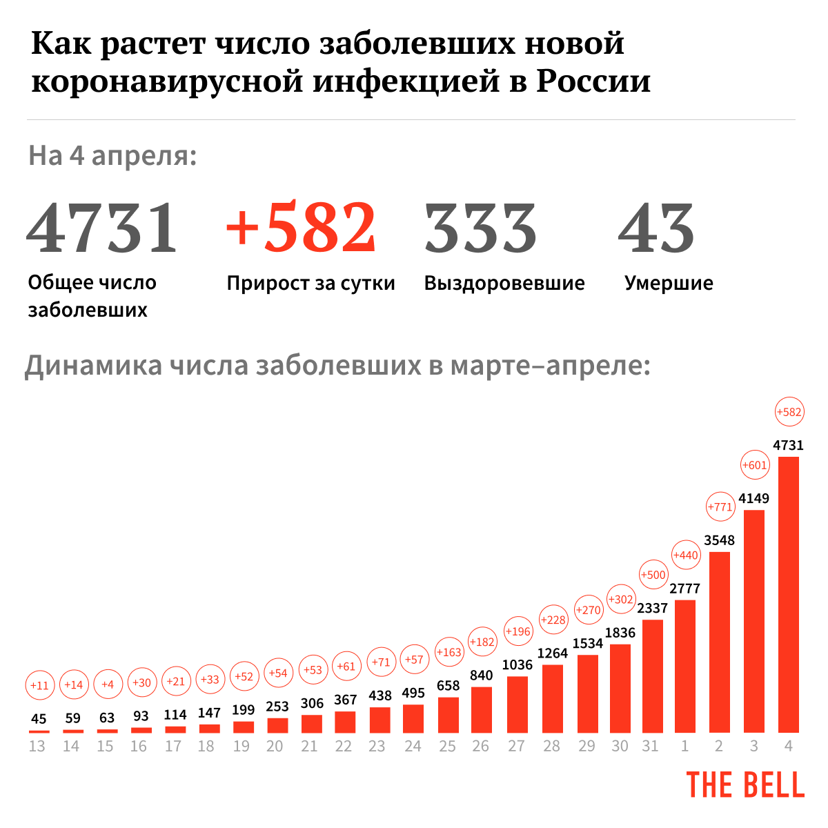 - Заразились: 4731 человек (+582 случая за сутки, 434 из них в Москве)