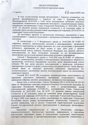 Прокурор вынес предостережение Буракову о недопустимости нарушения законодательства о публичных мероприятиях. Кроме того, надзорное ведомство «предостерегло» предпринимателя от нарушения законодательства в области санитарно-эпидемиологического благополучия населения: в Удмуртии действует режим повышенной готовности в связи с пандемией коронавируса.