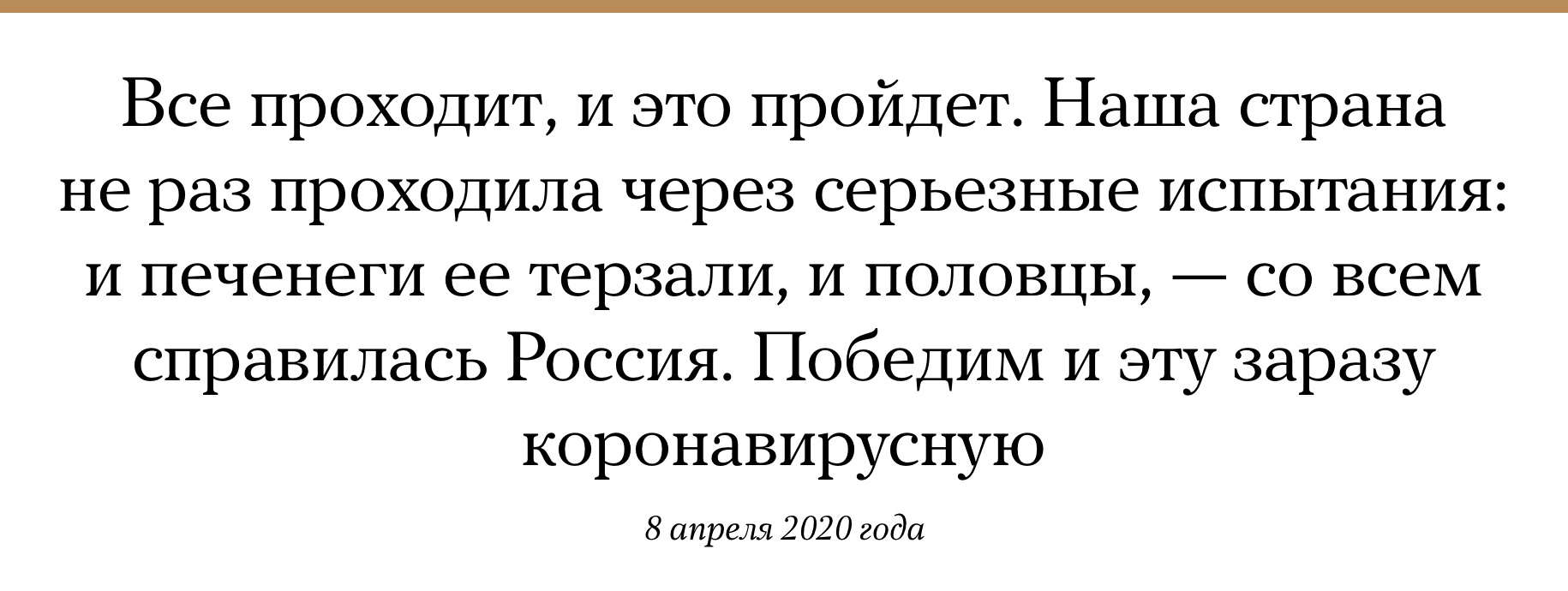 Президент России Владимир Путин 8 апреля провел селекторное совещание с главами регионов, на котором дал поручение о новых мерах поддержки населения на фоне пандемии коронавируса. В ходе совещания Путин также обратился к гражданам России, подчеркнув, что «режим самоизоляции, его испытания надо непременно выдержать».