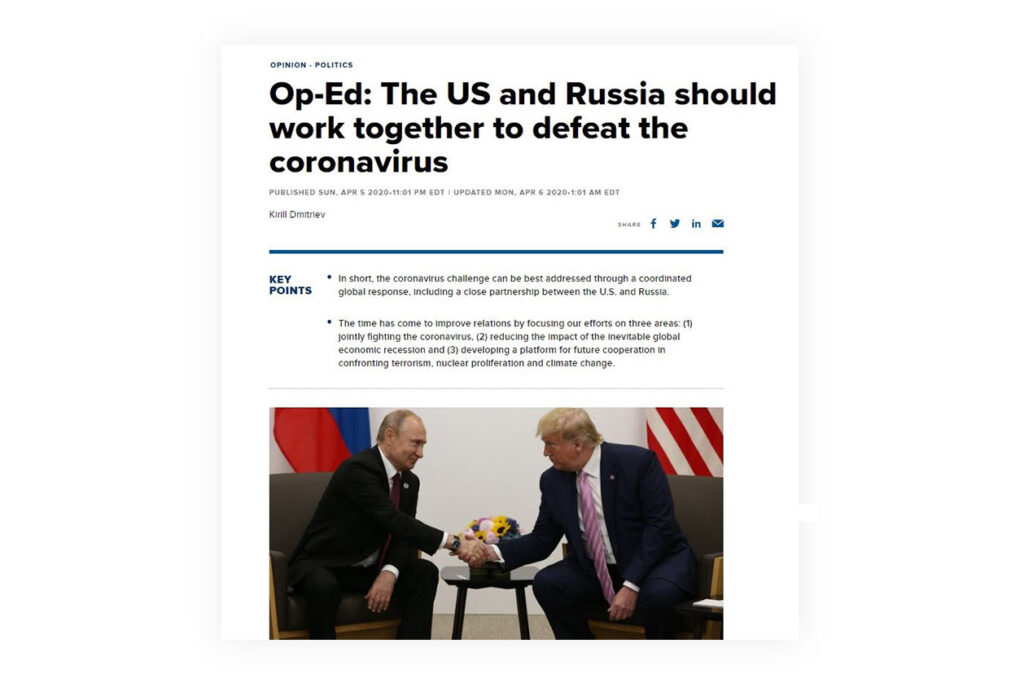 В этой же колонке Дмитриев призвал Россию и США, как 75 лет назад, объединиться для того, чтобы победить в войне с коронавирусом: