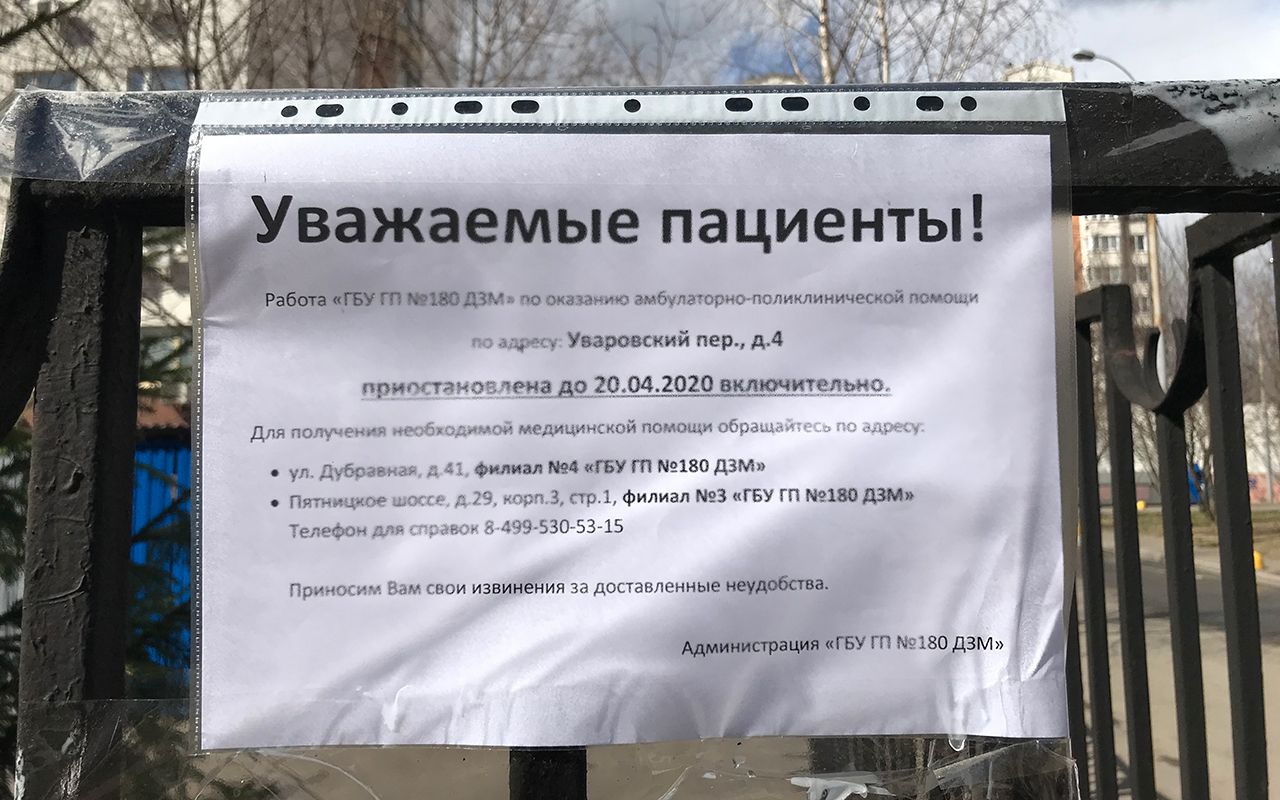 Работа поликлиники № 180 в Москве «приостановлена до 20.04.2020 включительно» — так сказано в объявлении на входе в здание. «Поликлиника на санобработке», — объяснил «Медузе» охранник у ворот. «Здание арестовано, потому что прошелся „красивый“ пациент, который болеет [коронавирусом]. Все этажи, которые он прошел, высажены на карантин на две недели», — так объяснили «Медузе» ситуацию на горячей линии учреждения.