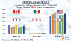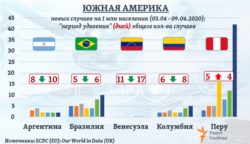 Разброс показателей по разным странам может быть внушительным. Для сравнения мы выделили статистику за минувшие семь дней (с 3-го по 9-ое апреля) по нескольким странам в каждом из регионов мира. Обратим внимание, что в большинстве из них, даже при сохранении высоких уровней новых случаев заболевания, выявляемых ежедневно (в расчете на 1 млн населения), общие темпы его распространения демонстрируют все же некую тенденцию к замедлению.