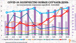 По расчетам аналитиков проекта Our World in Data, основанным на данных по странам мира от Европейского центра предупреждения и контроля заболеваний (ECDC), обновляемых ежедневно, если в России этот показатель составлял тогда 3,4 случая на 1 млн населения, то в среднем по миру – 9,4. Однако уже к 10 апреля они почти сравнялись: 11,2 – в мире, более 10 случаев на 1 млн человек – в России.