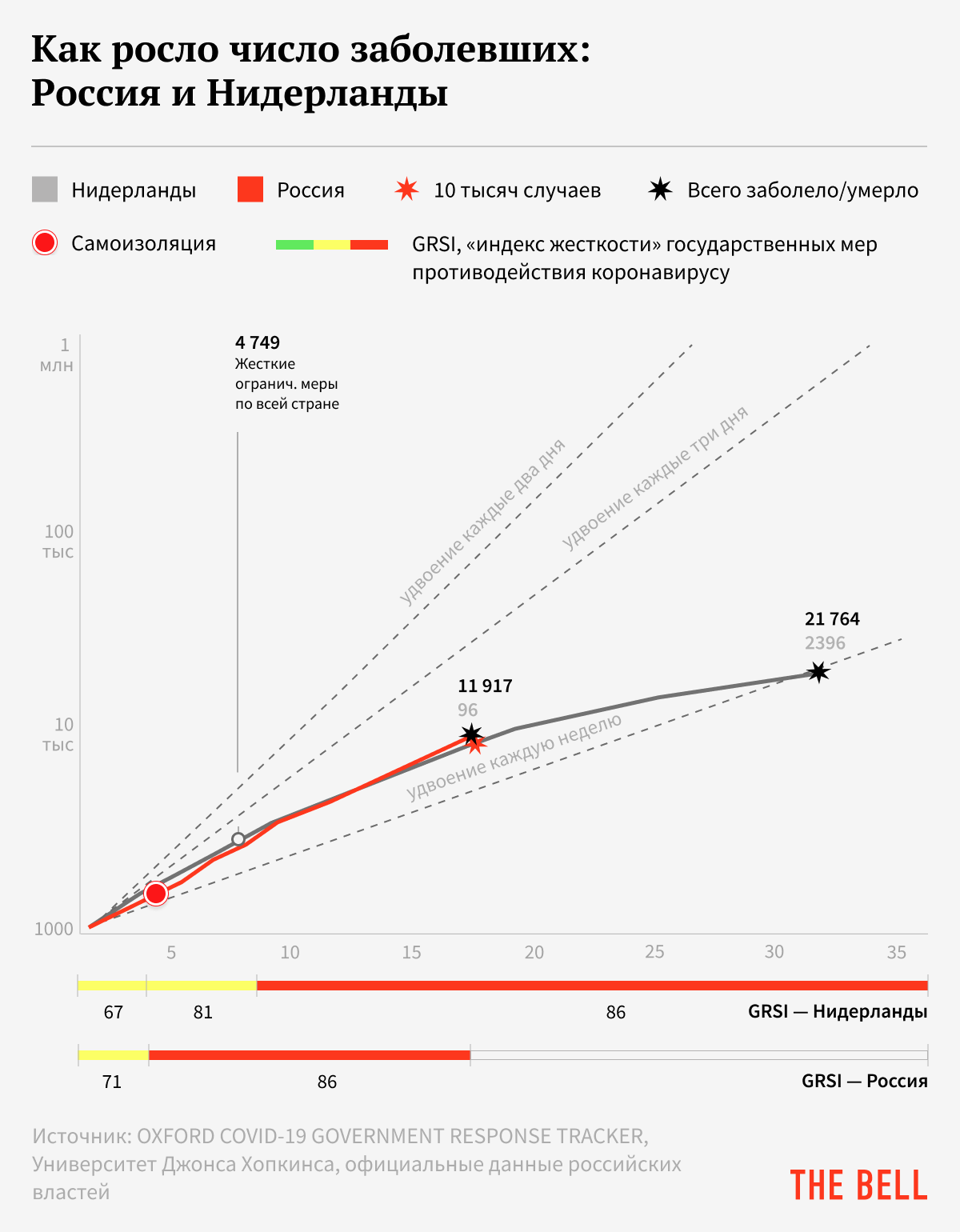 Самой похожей на российскую кривую оказалась голландская — цифры прироста до уровня 10–12 тысяч заболевших практически идентичны. И Нидерланды, и Россия на момент, когда число заболевших превысило тысячу, уже имели достаточно высокий «индекс жесткости» — 66,7 и 71,4 соответственно. После этого он рос у обеих стран и сейчас находится на одинаковом уровне, близком к 86. Но в Нидерландах жесткие ограничения на выход из дома ввели только 23 марта — когда число заболевших достигло 4,7 тысячи человек.
