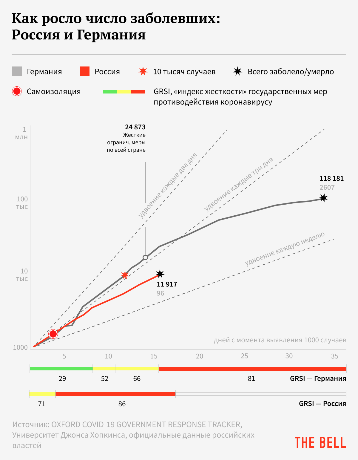 Германия отменяла мероприятия и закрывала общественные пространства постепенно, пока 22 марта не запретила по всей стране собираться больше чем вдвоем и обязала соблюдать дистанцию в 1,5 метра. «Индекс жесткости», который на момент прохождения границы в 1000 заболевших был низким, после этого превысил 80 — но к тому моменту в Германии уже было почти 25 тысяч больных. В заслугу стране также ставят обеспеченность медикаментами и средствами защиты, техникой — врачей и больниц.