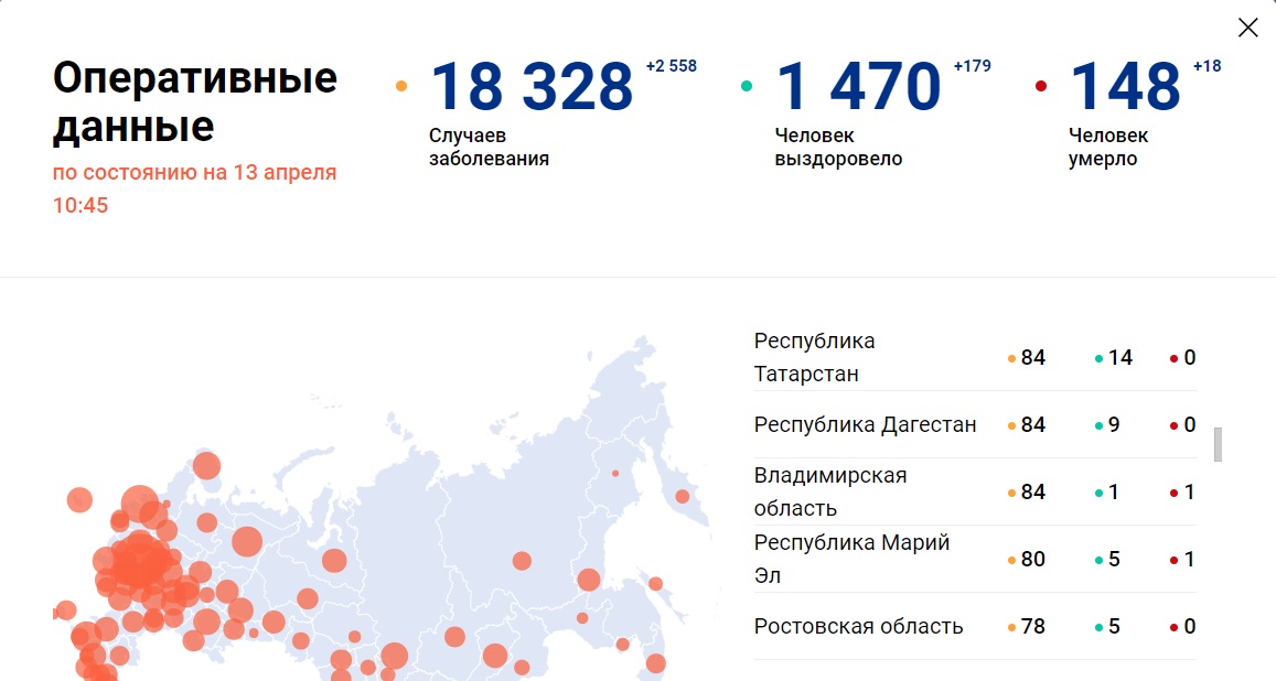 Posted on 13 апреля, 202013 апреля, 2020Во Владимирской области зафиксировано 84 случая заболевания коронавирусом, 13 из них – за последние сутки.