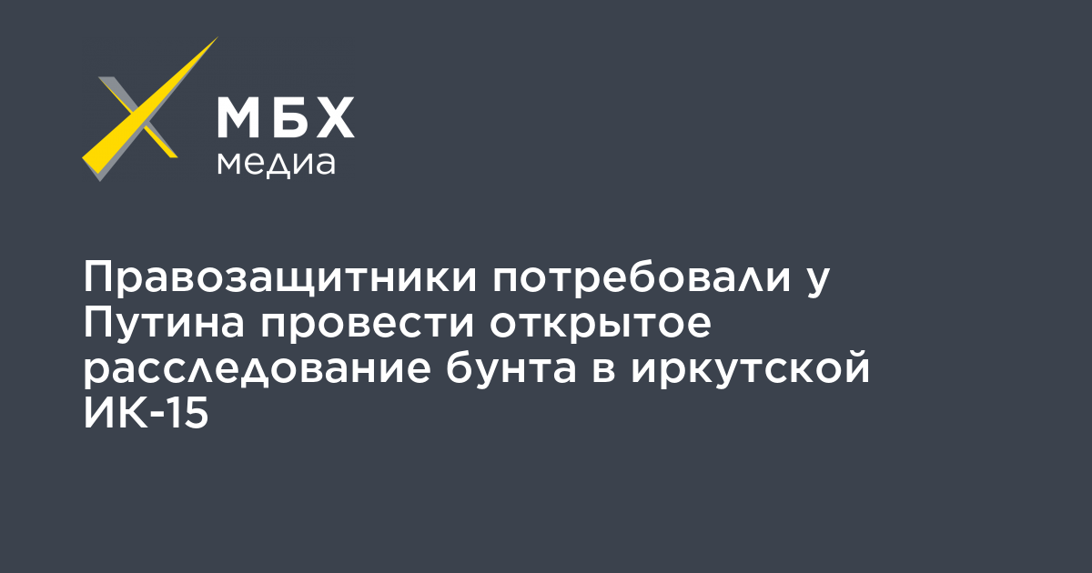 Правозащитники, активисты и журналисты обратились к президенту Владимиру Путину, главе Следственного комитета Александру Бастрыкину, директору ФСИН Александру Калашникову и генпрокурору Игорю Краснову с требованием открытого расследования произошедшего во время бунта в ИК-15 Иркутской области. Заявление опубликовано на сайте общественной организации «За права человека».