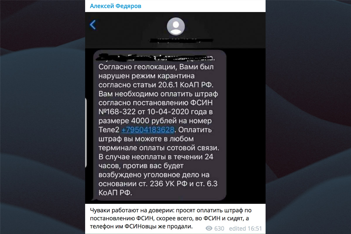 Мошенники могут сообщить через sms, что вы нарушили режим самоизоляции и попросить оплатить штраф, отправив деньги на сомнительный номер. Обычно штрафы оплачиваются на сайте gosuslugi.ru, mos.ru или в отделении банка.