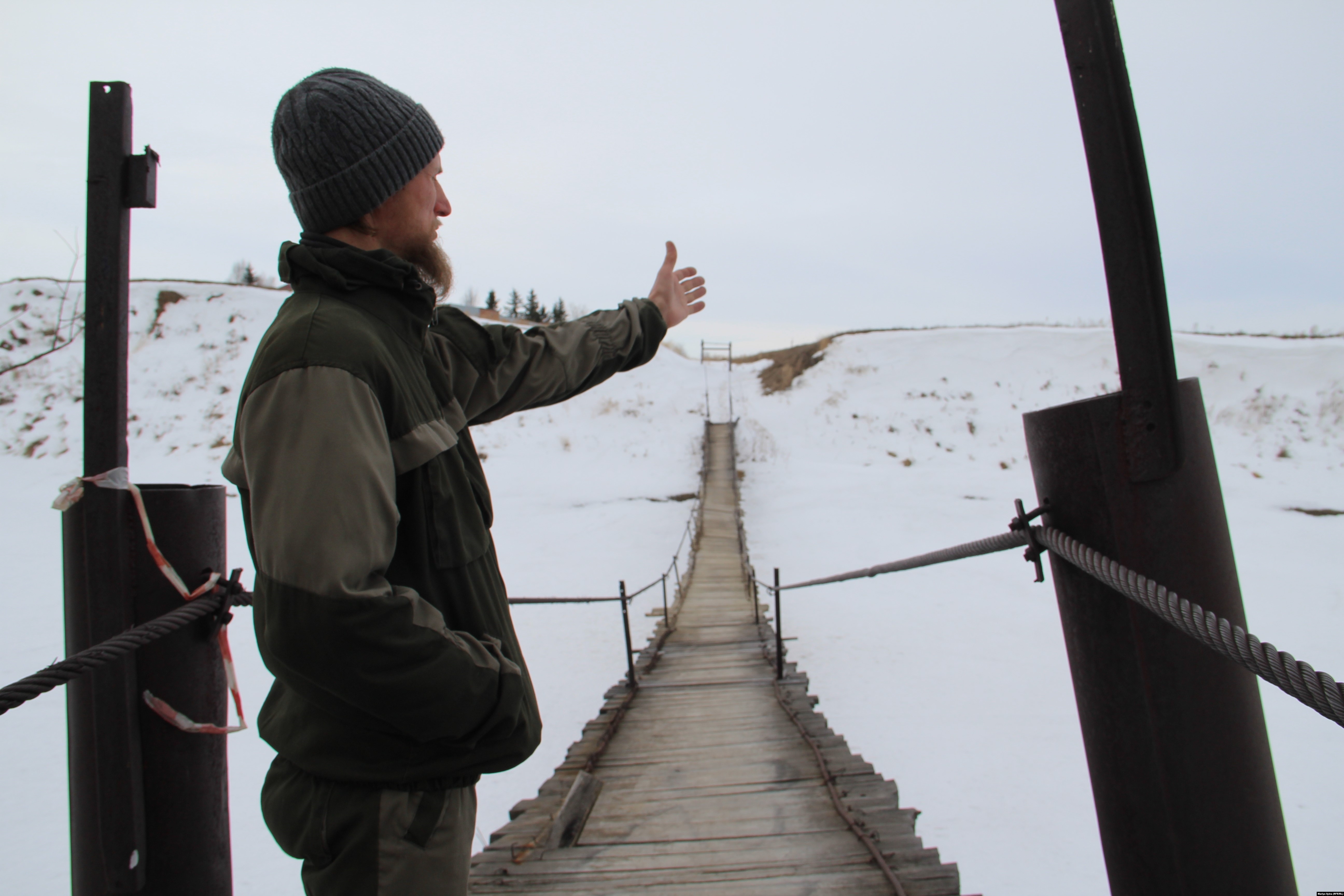 Конструкция моста, соединяющего деревни Игнатьево и Самаринка, простенькая – на металлические тросы, которые держатся за высокие столбы-опоры по разным берегам реки, привязаны плашки размером чуть больше метра в длину. Когда-то они были уложены плотно, но дерево обветшало и сквозь щели далеко внизу виден тающий речной лед. Заграждений по бокам нет, перилами служат два троса, отполированные руками и временем. Павел, впрочем, давно привык балансировать и за импровизированные перила не держится. Обрывки красной заградительной ленты, болтающейся на опорах, не смущают ни его, ни других жителей Игнатьева, где осталось чуть больше полусотни жителей.