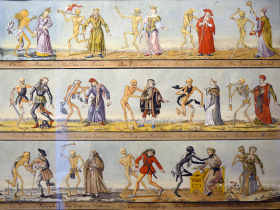 Пляска смерти. Акварельная копия Йоханна Рудольфа Фойерабенда. 1806 В истории искусства известно несколько версий этого жанра: это особенно прижившийся в Германии Totentanz («Пляска смерти»), барочные натюрморты Vanitas («Суета сует») и часто встречавшиеся в живописи высокого Ренессанса и викторианской Англии «Три возраста жизни». Vanitas развивался вместе с протестантизмом, не признававшим иконы, и получил распространение в Нидерландах XVII века, а затем в Америке под влиянием пуританских идей. Его ключевые символы — череп, песочные часы, тюльпан — символизировали разложение, время и увядание. В «Пляске смерти» скелет хватает кого угодно — стариков, молодых и младенцев, — чтобы напомнить, что человек смертен в любом возрасте. В вариантах жанра «Три возраста жизни» мы видим, как один и тот же человек, представленный в разных жизненных фазах, поднимается к вершине лестницы — времени своего расцвета — и стареет, спускаясь вниз.