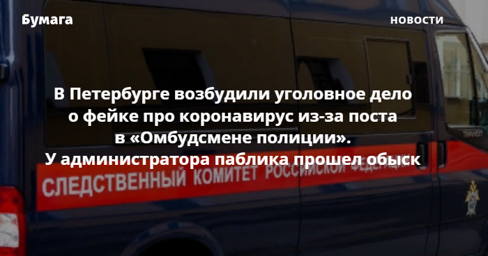 В Петербурге возбудили уголовное дело о фейке про коронавирус из-за поста, сделанного от лица администратора паблика «Омбудсмен полиции» Владимира Воронцова.