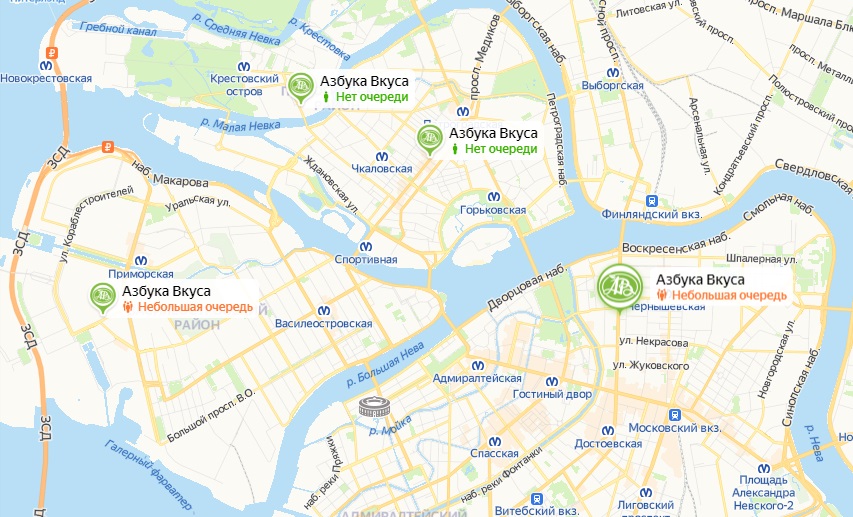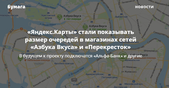 Сервис «Яндекс.Карты» начал показывать размер очередей в некоторых продуктовых магазинах сетей «Азбука вкуса» и «Перекресток» в Москве и Петербурге. Функция пока доступна лишь в веб-версии. Об этом «Бумаге» сообщили в пресс-службе «Яндекса».