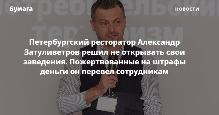 «Бумага» взяла интервью у Александра Затуливетрова о том, почему он собирался открыть свои заведения, несмотря на запрет. Ресторатор подробно рассказал о проблемах заведений общепита во время пандемии коронавируса.