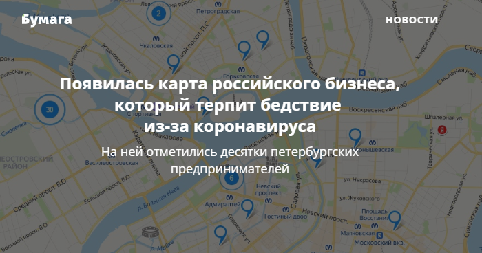 — Мы призываем предпринимателей, которые терпят крах из-за карантина, размещать на ней метки с обозначением своего дела. <…> Конкретные бизнесы в виде меток на карте — конкретные проблемы. Спорить с этими данными госслужащим и политикам будет невозможно. Если вам нечем платить зарплату сотрудникам, нечем платить за аренду и по кредитным обязательствам, если вы стоите на грани банкротства — не молчите, расскажите о своей ситуации. Если ваш бизнес уже погиб из-за карантина — заявите об этом.