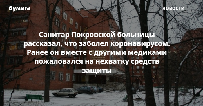 Санитар Покровской больницы Ярослав, который вместе с другими медиками жаловался на нехватку средств защиты в учреждении, заявил, что получил положительный результат теста на коронавирус. Об этом он рассказал «Фонтанке» и Znak.com.