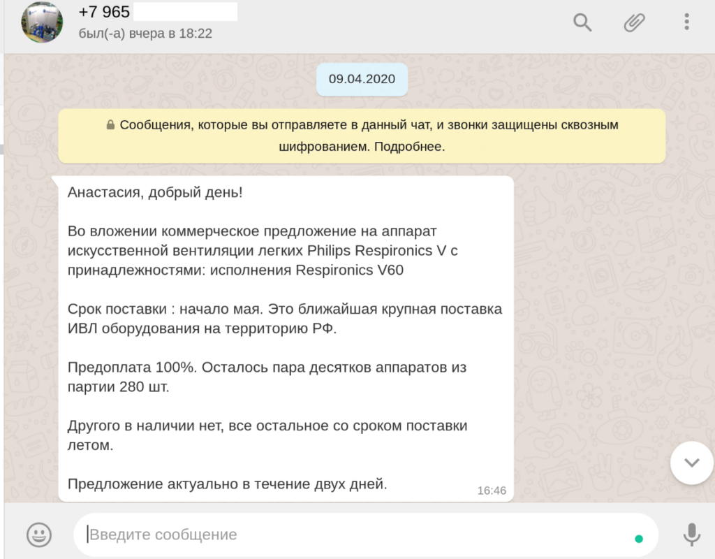 Во всех фирмах предложили оформить предзаказ на полноценный аппарат ИВЛ, но посоветовали поторопиться: хотя привезут их в лучшем случае в середине мая, большинство уже застолбили. Две компании ждут ближайшую поставку только в июле-августе. Из 280 аппаратов ИВЛ Philips Respironics V за 2 млн рублей, которые компания «МедэкСтарз» обещает привезти к началу мая, «свободна» только пара десятков — при том, что дистрибьютор требует полную предоплату (это прописано в «коммерческом предложении»).